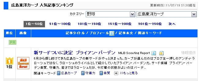 「新サードついに決定 ブライアン・バーデン」がブログ村 人気記事ランキング 広島東洋カープ部門で1位になりました。